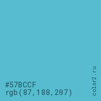 Цвет #57BCCF в цветовой модели RGB обозначается тремя октетами (87, 188, 207) в десятичном формате и #57BCCF в шестнадцатиричном (hex) формате, которые являются интенсивностью красного 87 (hex 57), интенсивность зелёного 188 (hex BC) и интенсивность синего 207 (hex CF).