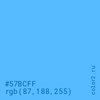Цвет #57BCFF в цветовой модели RGB обозначается тремя октетами (87, 188, 255) в десятичном формате и #57BCFF в шестнадцатиричном (hex) формате, которые являются интенсивностью красного 87 (hex 57), интенсивность зелёного 188 (hex BC) и интенсивность синего 255 (hex FF).