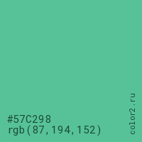 Цвет #57C298 в цветовой модели RGB обозначается тремя октетами (87, 194, 152) в десятичном формате и #57C298 в шестнадцатиричном (hex) формате, которые являются интенсивностью красного 87 (hex 57), интенсивность зелёного 194 (hex C2) и интенсивность синего 152 (hex 98).