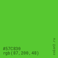 Цвет #57C830 в цветовой модели RGB обозначается тремя октетами (87, 200, 48) в десятичном формате и #57C830 в шестнадцатиричном (hex) формате, которые являются интенсивностью красного 87 (hex 57), интенсивность зелёного 200 (hex C8) и интенсивность синего 48 (hex 30).