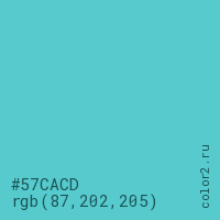 Цвет #57CACD в цветовой модели RGB обозначается тремя октетами (87, 202, 205) в десятичном формате и #57CACD в шестнадцатиричном (hex) формате, которые являются интенсивностью красного 87 (hex 57), интенсивность зелёного 202 (hex CA) и интенсивность синего 205 (hex CD).