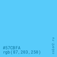 Цвет #57CBFA в цветовой модели RGB обозначается тремя октетами (87, 203, 250) в десятичном формате и #57CBFA в шестнадцатиричном (hex) формате, которые являются интенсивностью красного 87 (hex 57), интенсивность зелёного 203 (hex CB) и интенсивность синего 250 (hex FA).