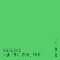 Цвет #57CE6C в цветовой модели RGB обозначается тремя октетами (87, 206, 108) в десятичном формате и #57CE6C в шестнадцатиричном (hex) формате, которые являются интенсивностью красного 87 (hex 57), интенсивность зелёного 206 (hex CE) и интенсивность синего 108 (hex 6C).