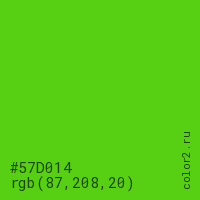 Цвет #57D014 в цветовой модели RGB обозначается тремя октетами (87, 208, 20) в десятичном формате и #57D014 в шестнадцатиричном (hex) формате, которые являются интенсивностью красного 87 (hex 57), интенсивность зелёного 208 (hex D0) и интенсивность синего 20 (hex 14).