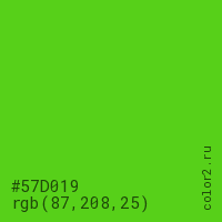 Цвет #57D019 в цветовой модели RGB обозначается тремя октетами (87, 208, 25) в десятичном формате и #57D019 в шестнадцатиричном (hex) формате, которые являются интенсивностью красного 87 (hex 57), интенсивность зелёного 208 (hex D0) и интенсивность синего 25 (hex 19).