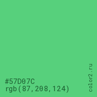 Цвет #57D07C в цветовой модели RGB обозначается тремя октетами (87, 208, 124) в десятичном формате и #57D07C в шестнадцатиричном (hex) формате, которые являются интенсивностью красного 87 (hex 57), интенсивность зелёного 208 (hex D0) и интенсивность синего 124 (hex 7C).