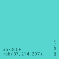 Цвет #57D6CF в цветовой модели RGB обозначается тремя октетами (87, 214, 207) в десятичном формате и #57D6CF в шестнадцатиричном (hex) формате, которые являются интенсивностью красного 87 (hex 57), интенсивность зелёного 214 (hex D6) и интенсивность синего 207 (hex CF).