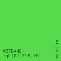 Цвет #57DA4B в цветовой модели RGB обозначается тремя октетами (87, 218, 75) в десятичном формате и #57DA4B в шестнадцатиричном (hex) формате, которые являются интенсивностью красного 87 (hex 57), интенсивность зелёного 218 (hex DA) и интенсивность синего 75 (hex 4B).