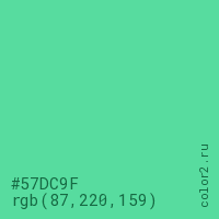 Цвет #57DC9F в цветовой модели RGB обозначается тремя октетами (87, 220, 159) в десятичном формате и #57DC9F в шестнадцатиричном (hex) формате, которые являются интенсивностью красного 87 (hex 57), интенсивность зелёного 220 (hex DC) и интенсивность синего 159 (hex 9F).