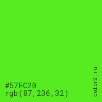 Цвет #57EC20 в цветовой модели RGB обозначается тремя октетами (87, 236, 32) в десятичном формате и #57EC20 в шестнадцатиричном (hex) формате, которые являются интенсивностью красного 87 (hex 57), интенсивность зелёного 236 (hex EC) и интенсивность синего 32 (hex 20).