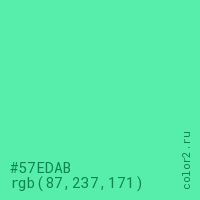 Цвет #57EDAB в цветовой модели RGB обозначается тремя октетами (87, 237, 171) в десятичном формате и #57EDAB в шестнадцатиричном (hex) формате, которые являются интенсивностью красного 87 (hex 57), интенсивность зелёного 237 (hex ED) и интенсивность синего 171 (hex AB).