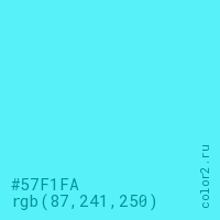 Цвет #57F1FA в цветовой модели RGB обозначается тремя октетами (87, 241, 250) в десятичном формате и #57F1FA в шестнадцатиричном (hex) формате, которые являются интенсивностью красного 87 (hex 57), интенсивность зелёного 241 (hex F1) и интенсивность синего 250 (hex FA).
