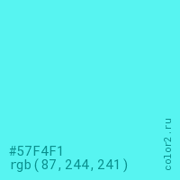 Цвет #57F4F1 в цветовой модели RGB обозначается тремя октетами (87, 244, 241) в десятичном формате и #57F4F1 в шестнадцатиричном (hex) формате, которые являются интенсивностью красного 87 (hex 57), интенсивность зелёного 244 (hex F4) и интенсивность синего 241 (hex F1).
