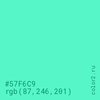 Цвет #57F6C9 в цветовой модели RGB обозначается тремя октетами (87, 246, 201) в десятичном формате и #57F6C9 в шестнадцатиричном (hex) формате, которые являются интенсивностью красного 87 (hex 57), интенсивность зелёного 246 (hex F6) и интенсивность синего 201 (hex C9).