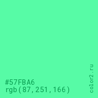 Цвет #57FBA6 в цветовой модели RGB обозначается тремя октетами (87, 251, 166) в десятичном формате и #57FBA6 в шестнадцатиричном (hex) формате, которые являются интенсивностью красного 87 (hex 57), интенсивность зелёного 251 (hex FB) и интенсивность синего 166 (hex A6).