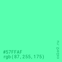 Цвет #57FFAF в цветовой модели RGB обозначается тремя октетами (87, 255, 175) в десятичном формате и #57FFAF в шестнадцатиричном (hex) формате, которые являются интенсивностью красного 87 (hex 57), интенсивность зелёного 255 (hex FF) и интенсивность синего 175 (hex AF).