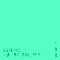 Цвет #57FFC5 в цветовой модели RGB обозначается тремя октетами (87, 255, 197) в десятичном формате и #57FFC5 в шестнадцатиричном (hex) формате, которые являются интенсивностью красного 87 (hex 57), интенсивность зелёного 255 (hex FF) и интенсивность синего 197 (hex C5).