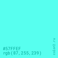 Цвет #57FFEF в цветовой модели RGB обозначается тремя октетами (87, 255, 239) в десятичном формате и #57FFEF в шестнадцатиричном (hex) формате, которые являются интенсивностью красного 87 (hex 57), интенсивность зелёного 255 (hex FF) и интенсивность синего 239 (hex EF).