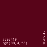 Цвет #580419 в цветовой модели RGB обозначается тремя октетами (88, 4, 25) в десятичном формате и #580419 в шестнадцатиричном (hex) формате, которые являются интенсивностью красного 88 (hex 58), интенсивность зелёного 4 (hex 04) и интенсивность синего 25 (hex 19).