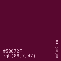 Цвет #58072F в цветовой модели RGB обозначается тремя октетами (88, 7, 47) в десятичном формате и #58072F в шестнадцатиричном (hex) формате, которые являются интенсивностью красного 88 (hex 58), интенсивность зелёного 7 (hex 07) и интенсивность синего 47 (hex 2F).