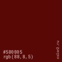 Цвет #580805 в цветовой модели RGB обозначается тремя октетами (88, 8, 5) в десятичном формате и #580805 в шестнадцатиричном (hex) формате, которые являются интенсивностью красного 88 (hex 58), интенсивность зелёного 8 (hex 08) и интенсивность синего 5 (hex 05).