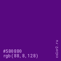 Цвет #580880 в цветовой модели RGB обозначается тремя октетами (88, 8, 128) в десятичном формате и #580880 в шестнадцатиричном (hex) формате, которые являются интенсивностью красного 88 (hex 58), интенсивность зелёного 8 (hex 08) и интенсивность синего 128 (hex 80).