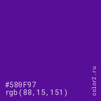 Цвет #580F97 в цветовой модели RGB обозначается тремя октетами (88, 15, 151) в десятичном формате и #580F97 в шестнадцатиричном (hex) формате, которые являются интенсивностью красного 88 (hex 58), интенсивность зелёного 15 (hex 0F) и интенсивность синего 151 (hex 97).