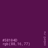 Цвет #58104D в цветовой модели RGB обозначается тремя октетами (88, 16, 77) в десятичном формате и #58104D в шестнадцатиричном (hex) формате, которые являются интенсивностью красного 88 (hex 58), интенсивность зелёного 16 (hex 10) и интенсивность синего 77 (hex 4D).