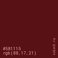 Цвет #581115 в цветовой модели RGB обозначается тремя октетами (88, 17, 21) в десятичном формате и #581115 в шестнадцатиричном (hex) формате, которые являются интенсивностью красного 88 (hex 58), интенсивность зелёного 17 (hex 11) и интенсивность синего 21 (hex 15).