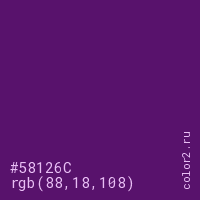 Цвет #58126C в цветовой модели RGB обозначается тремя октетами (88, 18, 108) в десятичном формате и #58126C в шестнадцатиричном (hex) формате, которые являются интенсивностью красного 88 (hex 58), интенсивность зелёного 18 (hex 12) и интенсивность синего 108 (hex 6C).