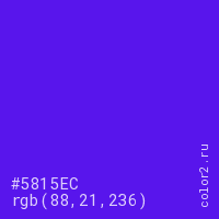 Цвет #5815EC в цветовой модели RGB обозначается тремя октетами (88, 21, 236) в десятичном формате и #5815EC в шестнадцатиричном (hex) формате, которые являются интенсивностью красного 88 (hex 58), интенсивность зелёного 21 (hex 15) и интенсивность синего 236 (hex EC).