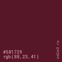 Цвет #581729 в цветовой модели RGB обозначается тремя октетами (88, 23, 41) в десятичном формате и #581729 в шестнадцатиричном (hex) формате, которые являются интенсивностью красного 88 (hex 58), интенсивность зелёного 23 (hex 17) и интенсивность синего 41 (hex 29).