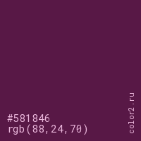 Цвет #581846 в цветовой модели RGB обозначается тремя октетами (88, 24, 70) в десятичном формате и #581846 в шестнадцатиричном (hex) формате, которые являются интенсивностью красного 88 (hex 58), интенсивность зелёного 24 (hex 18) и интенсивность синего 70 (hex 46).