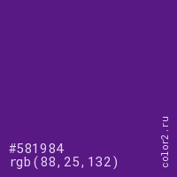 Цвет #581984 в цветовой модели RGB обозначается тремя октетами (88, 25, 132) в десятичном формате и #581984 в шестнадцатиричном (hex) формате, которые являются интенсивностью красного 88 (hex 58), интенсивность зелёного 25 (hex 19) и интенсивность синего 132 (hex 84).