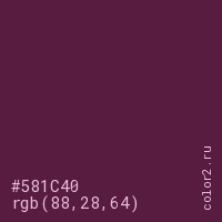 Цвет #581C40 в цветовой модели RGB обозначается тремя октетами (88, 28, 64) в десятичном формате и #581C40 в шестнадцатиричном (hex) формате, которые являются интенсивностью красного 88 (hex 58), интенсивность зелёного 28 (hex 1C) и интенсивность синего 64 (hex 40).