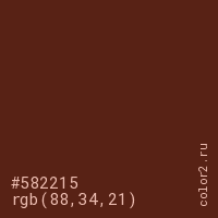 Цвет #582215 в цветовой модели RGB обозначается тремя октетами (88, 34, 21) в десятичном формате и #582215 в шестнадцатиричном (hex) формате, которые являются интенсивностью красного 88 (hex 58), интенсивность зелёного 34 (hex 22) и интенсивность синего 21 (hex 15).