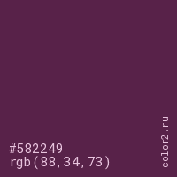 Цвет #582249 в цветовой модели RGB обозначается тремя октетами (88, 34, 73) в десятичном формате и #582249 в шестнадцатиричном (hex) формате, которые являются интенсивностью красного 88 (hex 58), интенсивность зелёного 34 (hex 22) и интенсивность синего 73 (hex 49).