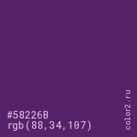 Цвет #58226B в цветовой модели RGB обозначается тремя октетами (88, 34, 107) в десятичном формате и #58226B в шестнадцатиричном (hex) формате, которые являются интенсивностью красного 88 (hex 58), интенсивность зелёного 34 (hex 22) и интенсивность синего 107 (hex 6B).