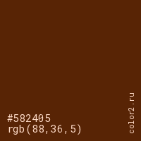 Цвет #582405 в цветовой модели RGB обозначается тремя октетами (88, 36, 5) в десятичном формате и #582405 в шестнадцатиричном (hex) формате, которые являются интенсивностью красного 88 (hex 58), интенсивность зелёного 36 (hex 24) и интенсивность синего 5 (hex 05).