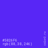 Цвет #5826F6 в цветовой модели RGB обозначается тремя октетами (88, 38, 246) в десятичном формате и #5826F6 в шестнадцатиричном (hex) формате, которые являются интенсивностью красного 88 (hex 58), интенсивность зелёного 38 (hex 26) и интенсивность синего 246 (hex F6).