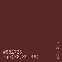 Цвет #582726 в цветовой модели RGB обозначается тремя октетами (88, 39, 38) в десятичном формате и #582726 в шестнадцатиричном (hex) формате, которые являются интенсивностью красного 88 (hex 58), интенсивность зелёного 39 (hex 27) и интенсивность синего 38 (hex 26).