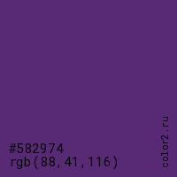Цвет #582974 в цветовой модели RGB обозначается тремя октетами (88, 41, 116) в десятичном формате и #582974 в шестнадцатиричном (hex) формате, которые являются интенсивностью красного 88 (hex 58), интенсивность зелёного 41 (hex 29) и интенсивность синего 116 (hex 74).