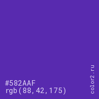 Цвет #582AAF в цветовой модели RGB обозначается тремя октетами (88, 42, 175) в десятичном формате и #582AAF в шестнадцатиричном (hex) формате, которые являются интенсивностью красного 88 (hex 58), интенсивность зелёного 42 (hex 2A) и интенсивность синего 175 (hex AF).
