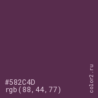 Цвет #582C4D в цветовой модели RGB обозначается тремя октетами (88, 44, 77) в десятичном формате и #582C4D в шестнадцатиричном (hex) формате, которые являются интенсивностью красного 88 (hex 58), интенсивность зелёного 44 (hex 2C) и интенсивность синего 77 (hex 4D).