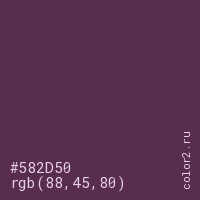 Цвет #582D50 в цветовой модели RGB обозначается тремя октетами (88, 45, 80) в десятичном формате и #582D50 в шестнадцатиричном (hex) формате, которые являются интенсивностью красного 88 (hex 58), интенсивность зелёного 45 (hex 2D) и интенсивность синего 80 (hex 50).