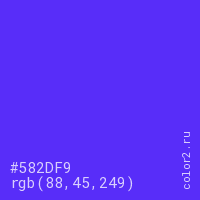 Цвет #582DF9 в цветовой модели RGB обозначается тремя октетами (88, 45, 249) в десятичном формате и #582DF9 в шестнадцатиричном (hex) формате, которые являются интенсивностью красного 88 (hex 58), интенсивность зелёного 45 (hex 2D) и интенсивность синего 249 (hex F9).