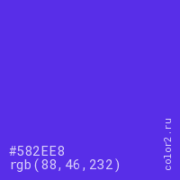 Цвет #582EE8 в цветовой модели RGB обозначается тремя октетами (88, 46, 232) в десятичном формате и #582EE8 в шестнадцатиричном (hex) формате, которые являются интенсивностью красного 88 (hex 58), интенсивность зелёного 46 (hex 2E) и интенсивность синего 232 (hex E8).