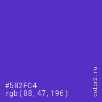 Цвет #582FC4 в цветовой модели RGB обозначается тремя октетами (88, 47, 196) в десятичном формате и #582FC4 в шестнадцатиричном (hex) формате, которые являются интенсивностью красного 88 (hex 58), интенсивность зелёного 47 (hex 2F) и интенсивность синего 196 (hex C4).