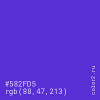 Цвет #582FD5 в цветовой модели RGB обозначается тремя октетами (88, 47, 213) в десятичном формате и #582FD5 в шестнадцатиричном (hex) формате, которые являются интенсивностью красного 88 (hex 58), интенсивность зелёного 47 (hex 2F) и интенсивность синего 213 (hex D5).
