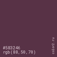 Цвет #583246 в цветовой модели RGB обозначается тремя октетами (88, 50, 70) в десятичном формате и #583246 в шестнадцатиричном (hex) формате, которые являются интенсивностью красного 88 (hex 58), интенсивность зелёного 50 (hex 32) и интенсивность синего 70 (hex 46).